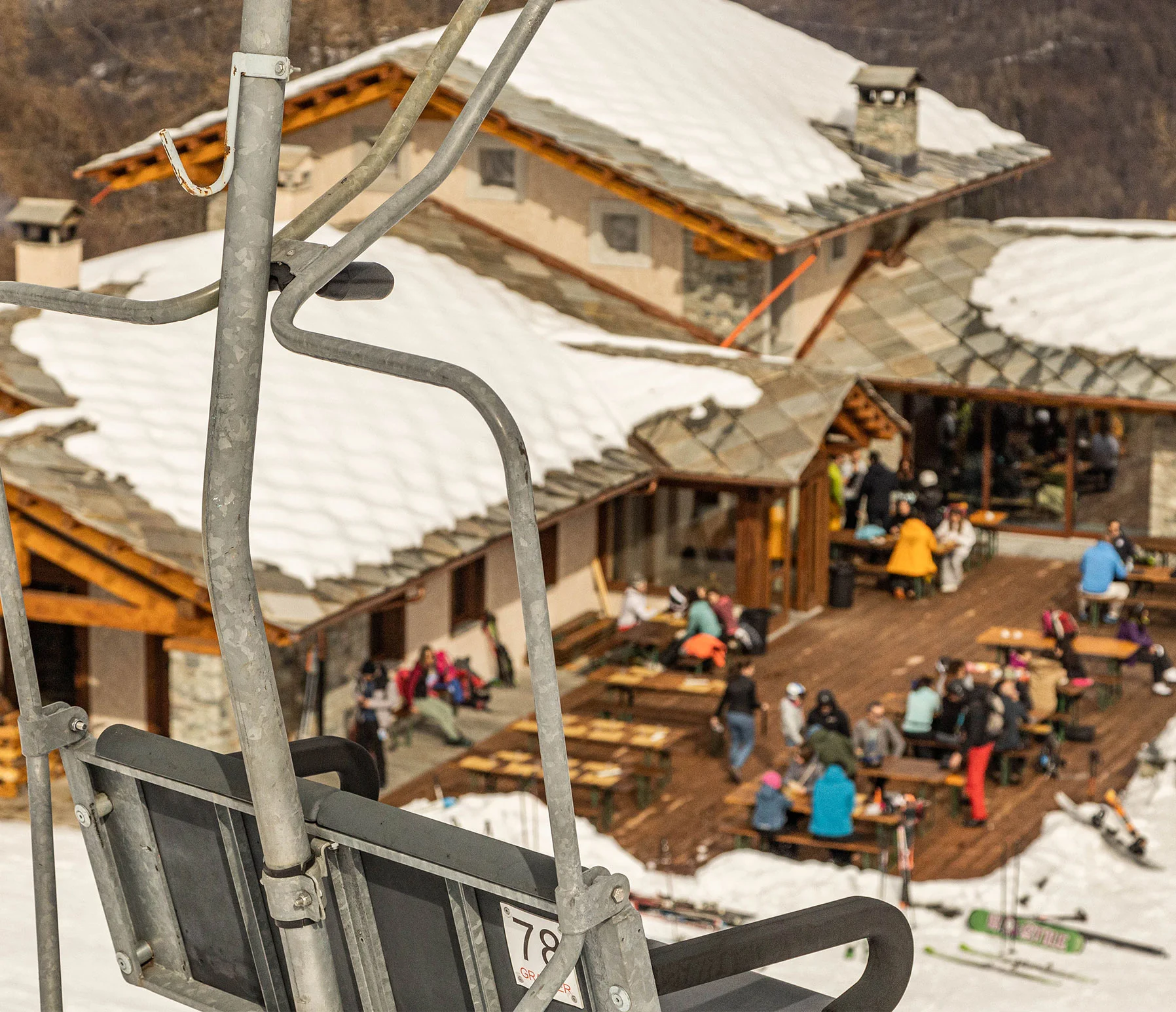 Tappa ufficiale degli impianti Sampeyre 365. Con la seggiovia Sant'Anna arrivi direttamente nei pressi della struttura — la pausa perfetta tra una discesa e l'altra.